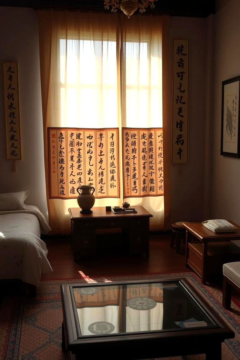 A fusion of art and function, calligraphic textiles introduce an element of sophisticated design into the bedroom. This idea leverages bedding, curtains, and cushions featuring traditional Chinese calligraphy patterns that speak to historical elegance and literary art. The delicate strokes and rhythmic flow of calligraphy enhance the room’s aesthetic while providing a cultural narrative. Actionable tips include coordinating these textiles with simple furniture pieces to allow the designs to shine. Revel in a space that combines comfort with a subtle yet impactful artistic legacy.