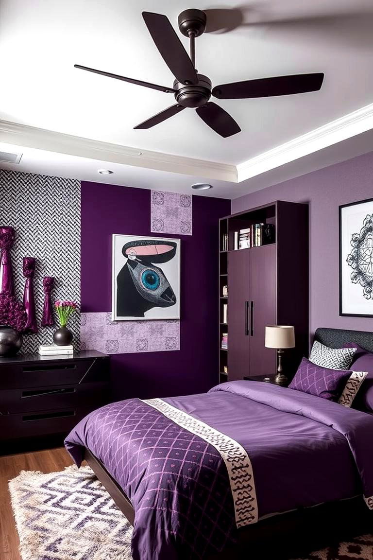 A striking blend of dark purple and geometric patterns breathes fresh life into this bedroom design. The interplay of angular lines and deep hues creates a visually stimulating yet harmonious space. Carefully chosen furnishings and décor pieces complement the bold backdrop without overwhelming the senses. Practical elements like smart storage and ambient lighting ensure that the design remains as functional as it is stylish. This idea offers a dynamic balance between art and utility, inviting you to enjoy a space that is both modern and expressive, making your bedroom a personal work of art.