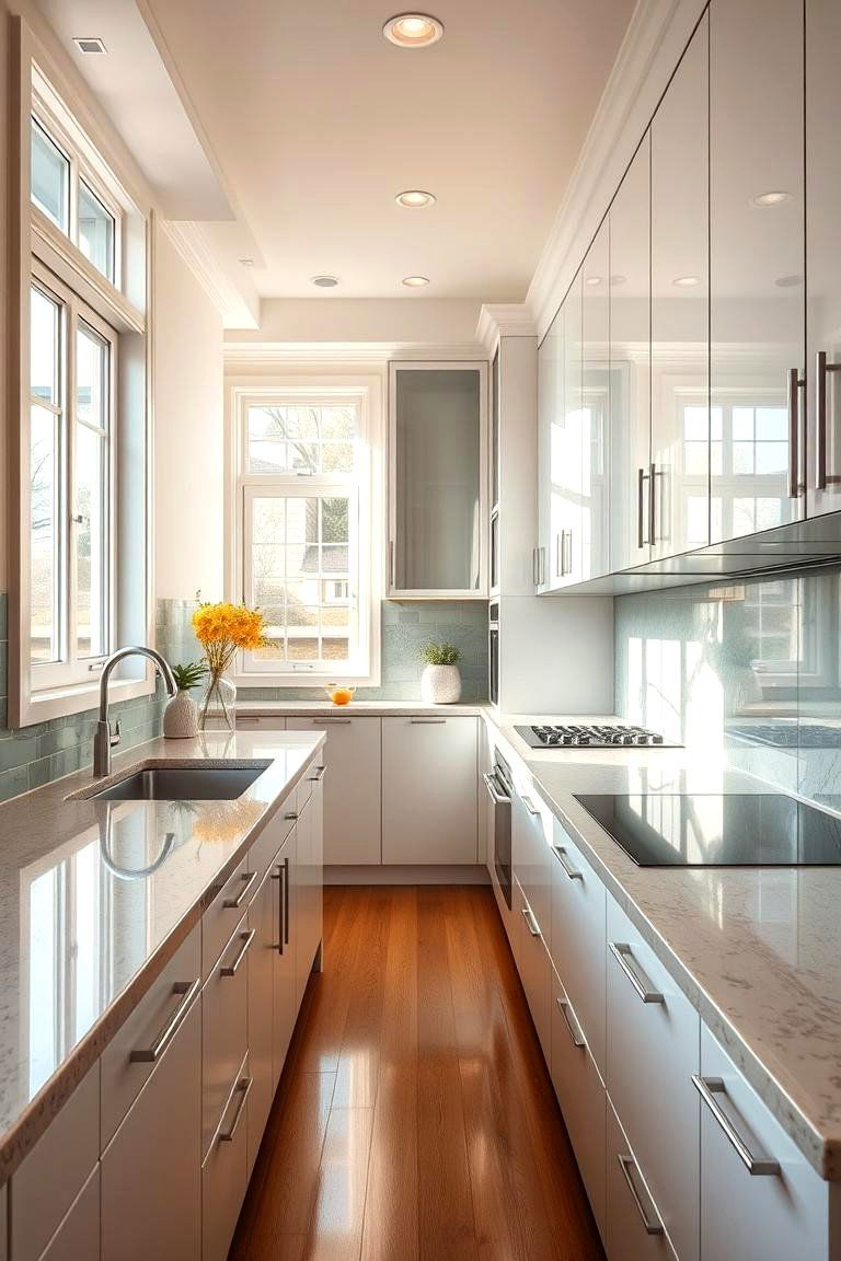 Reflective surfaces in a galley kitchen can dramatically enhance both natural and artificial light, making the space feel larger and brighter. Incorporate glossy countertops, mirrored backsplashes, or stainless steel accents to bounce light around. Actionable tips include selecting materials that are attractive and easy to clean. The reflective qualities minimize the need for extra lighting while adding a modern, sophisticated flair. This design trick not only improves visibility for meal prep but also creates a lively, open ambiance that transforms your compact kitchen into a vibrant and inviting space.