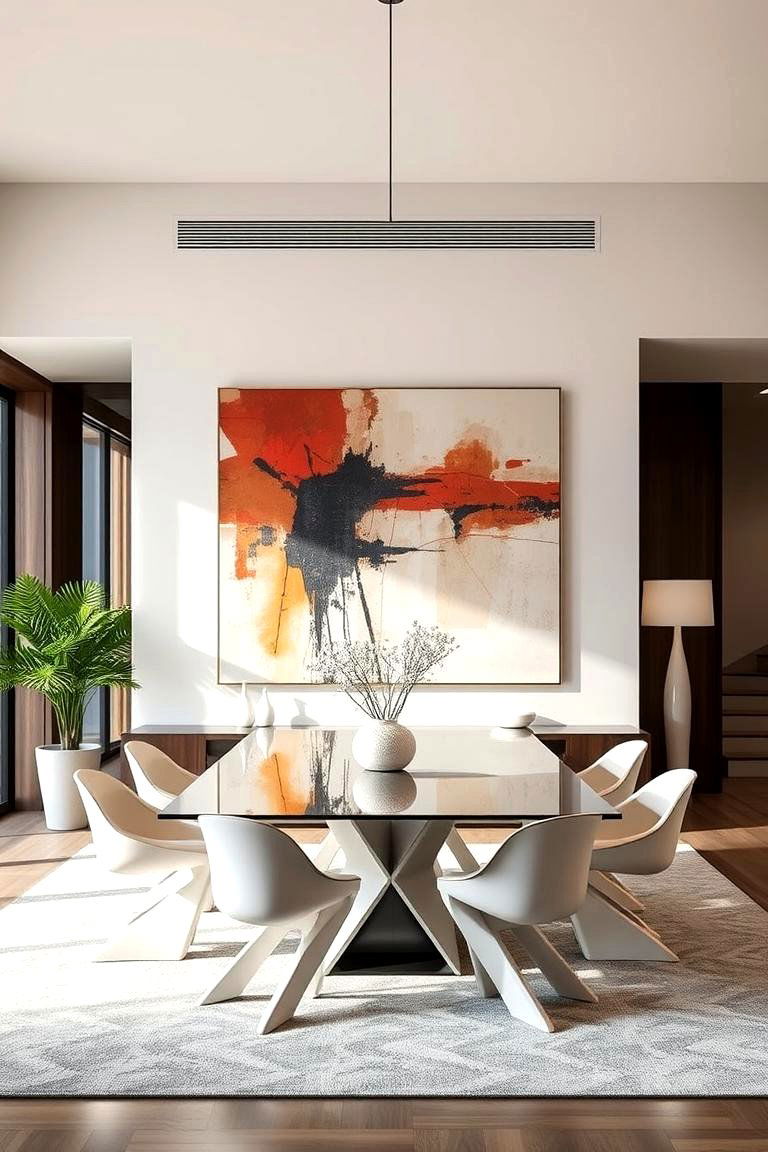 Adding artwork or sculptures to your dining room can inject personality and reflect your personal taste. Choose pieces that complement the overall style and color scheme of the room. Consider a large statement piece or a curated gallery wall.