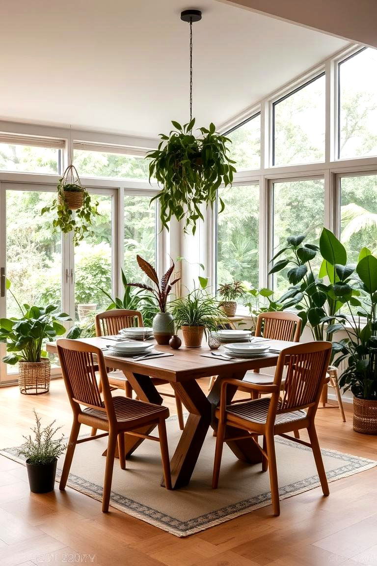 Bringing the outdoors in, biophilic dining rooms focus on connecting with nature through the use of natural materials, plants, and natural light. Think wooden furniture, stone accents, indoor plants of varying sizes, and large windows offering views of the outdoors. This style promotes well-being and creates a calming and refreshing atmosphere.